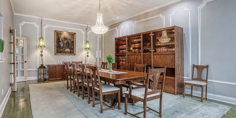 The magnificent dining room comfortably accommodates 14–18 guests, offering an inviting space for gatherings. It features exquisite hardwood flooring, distinctive decor, and expansive windows on two sides, filling the room with natural light and providing a stunning backdrop for any occasion.